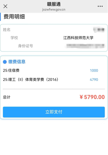 (3)在费用明细界面核对缴费项目明细、金额是否无误,确认无误后点击“立即支付”,跳转到支付界面,点击“立即支付” 完成扣款缴费。