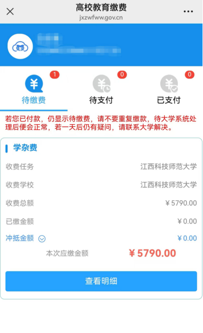 (2)输入身份证号、验证码点击“查询缴费”进入“待缴费”页面,核对学校、姓名、身份证信息是否正确,确认无误后点击“查看明细”进入费用明细界面。