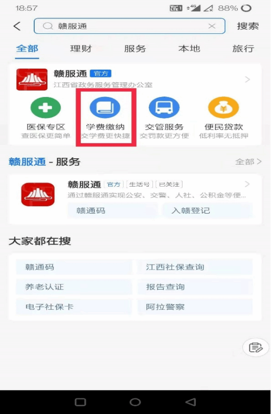 (1)打开支付宝搜索“赣服通”。