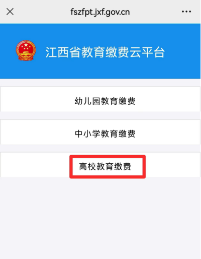 (1)进入江西省财政厅微信公众号,在下方“非税缴费”菜单中点击“教育缴费云平台”,根据自己学校的分类选择对应的缴费入口。