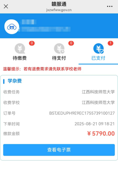 (6)缴费成功后,重新进入“缴费界面”,选择“已支付” →“查看电子票”。